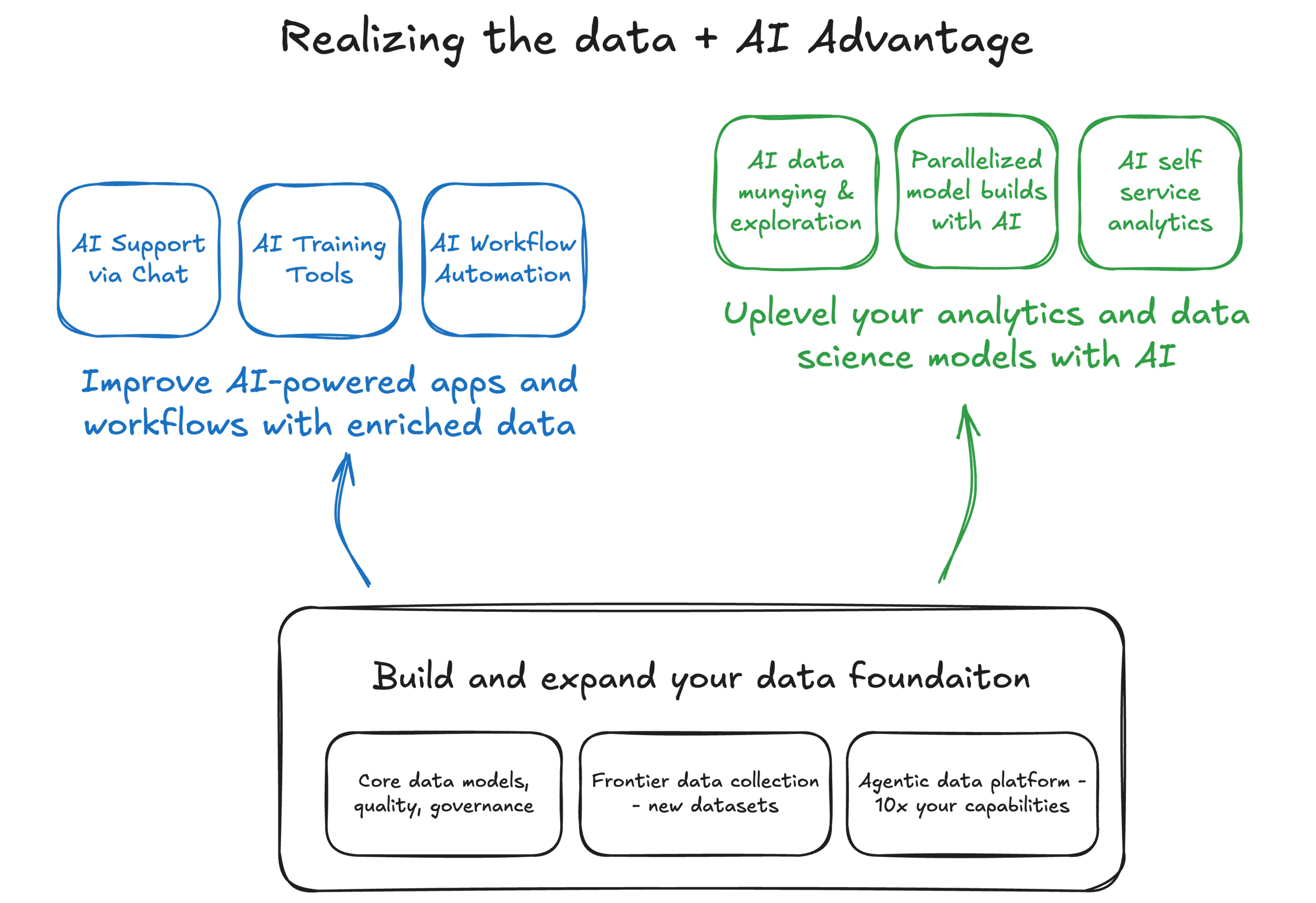 When we put this entire picture together – an agentic data platform that houses deep and rich context about your business and users, a high powered analytics and modeling arm, and differentiated AI user experiences powered by your rich data library – we can really see what it looks like when you create a flywheel between data and AI.