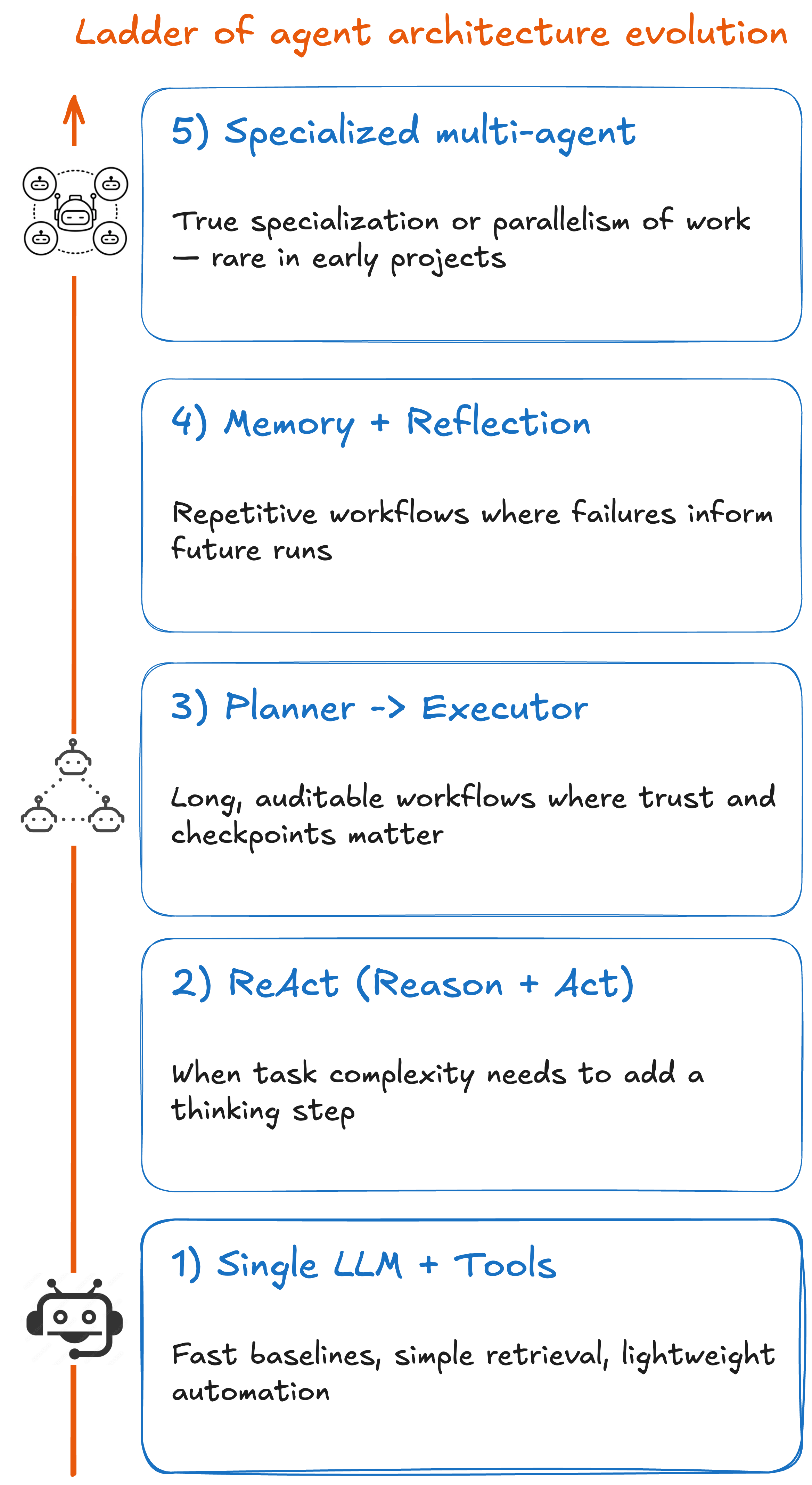 We think of agent architectures as a ladder. Each rung adds new abilities—but also new overhead. You should only climb when the pain of staying put is bigger than the cost of moving up.